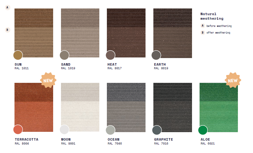 Efter montering udvikler pladerne en let patina, som herefter gradvist udjævnes. Afhængigt af bygningens eksponering og vejrforhold kan denne naturlige proces vare fra nogle uger til flere måneder.